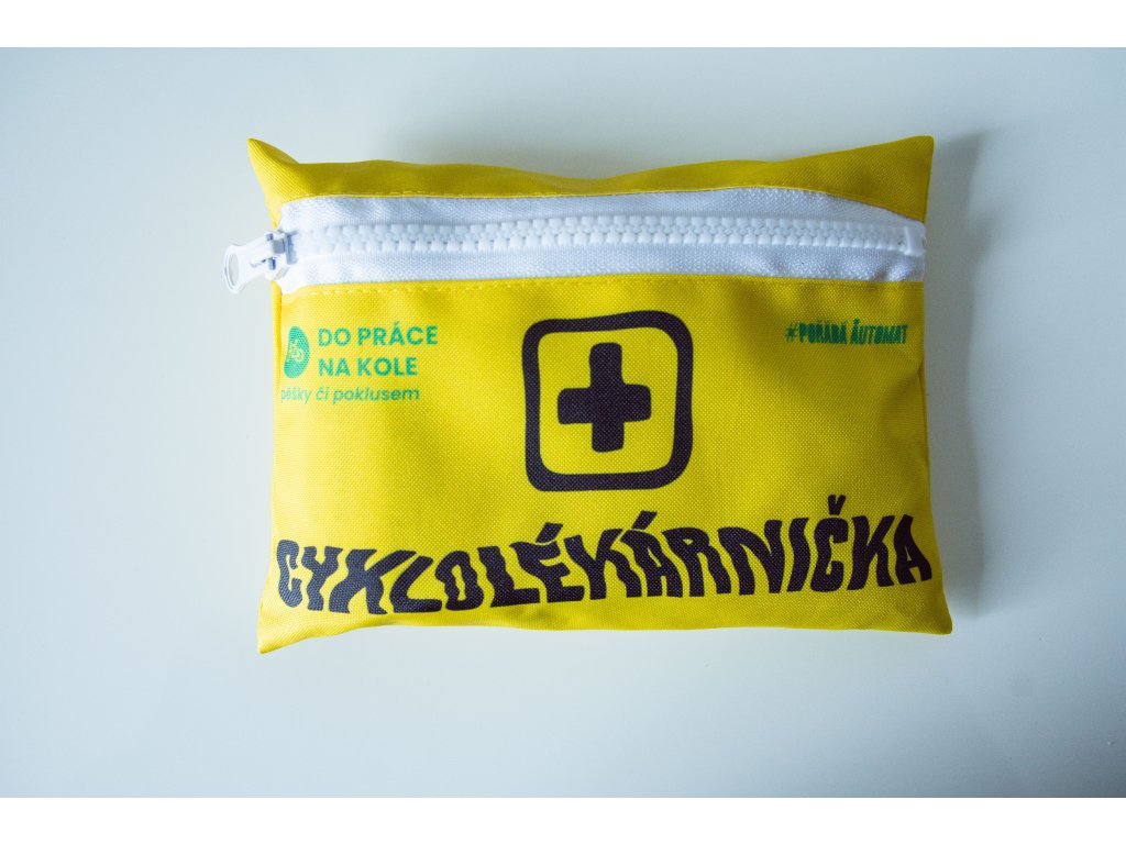 Vše, co potřebujete pro ošetření úrazů na jednom místě, v taštičce s vizuálem Do práce na kole, pěšky či poklusem 2025 od Markéty Černé.